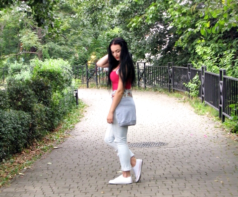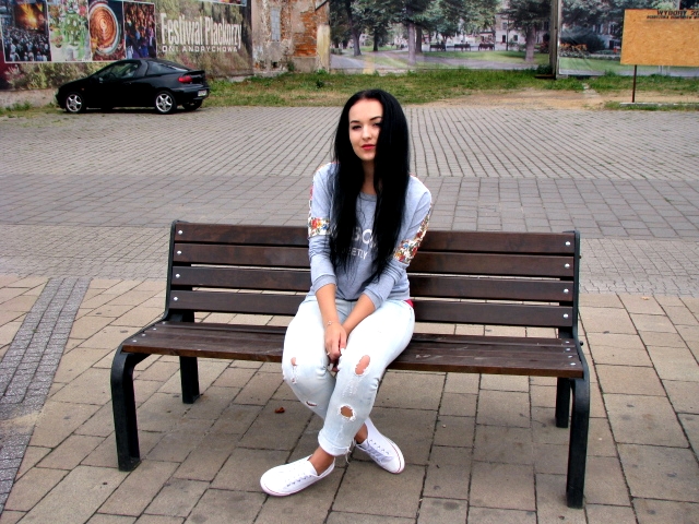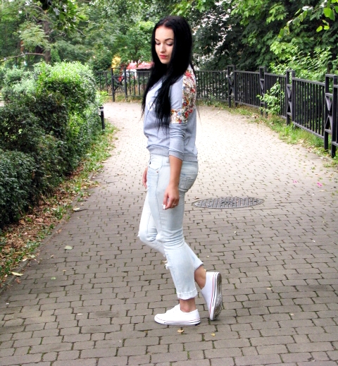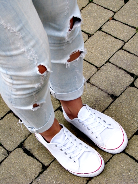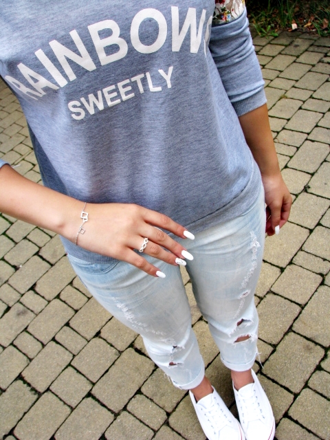 By nie było zbyt „grzecznie” dobrałam do niej poszarpane jeansy. Białe trampki i delikatna biżuteria dopełniły całość. Jak Wam się podoba? 🙂