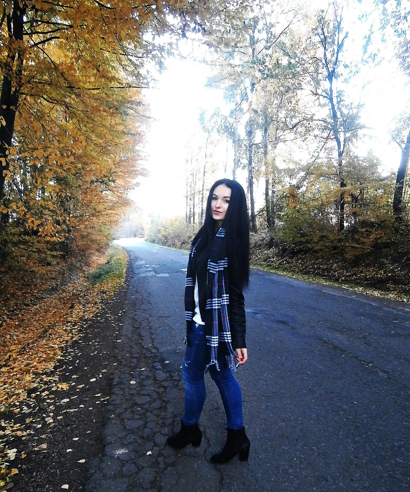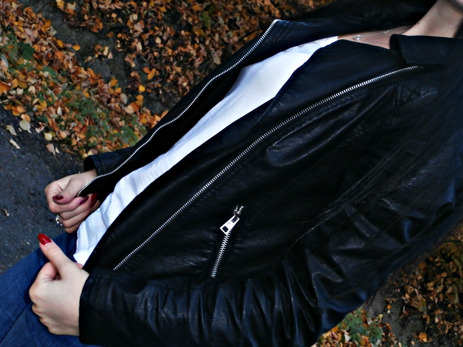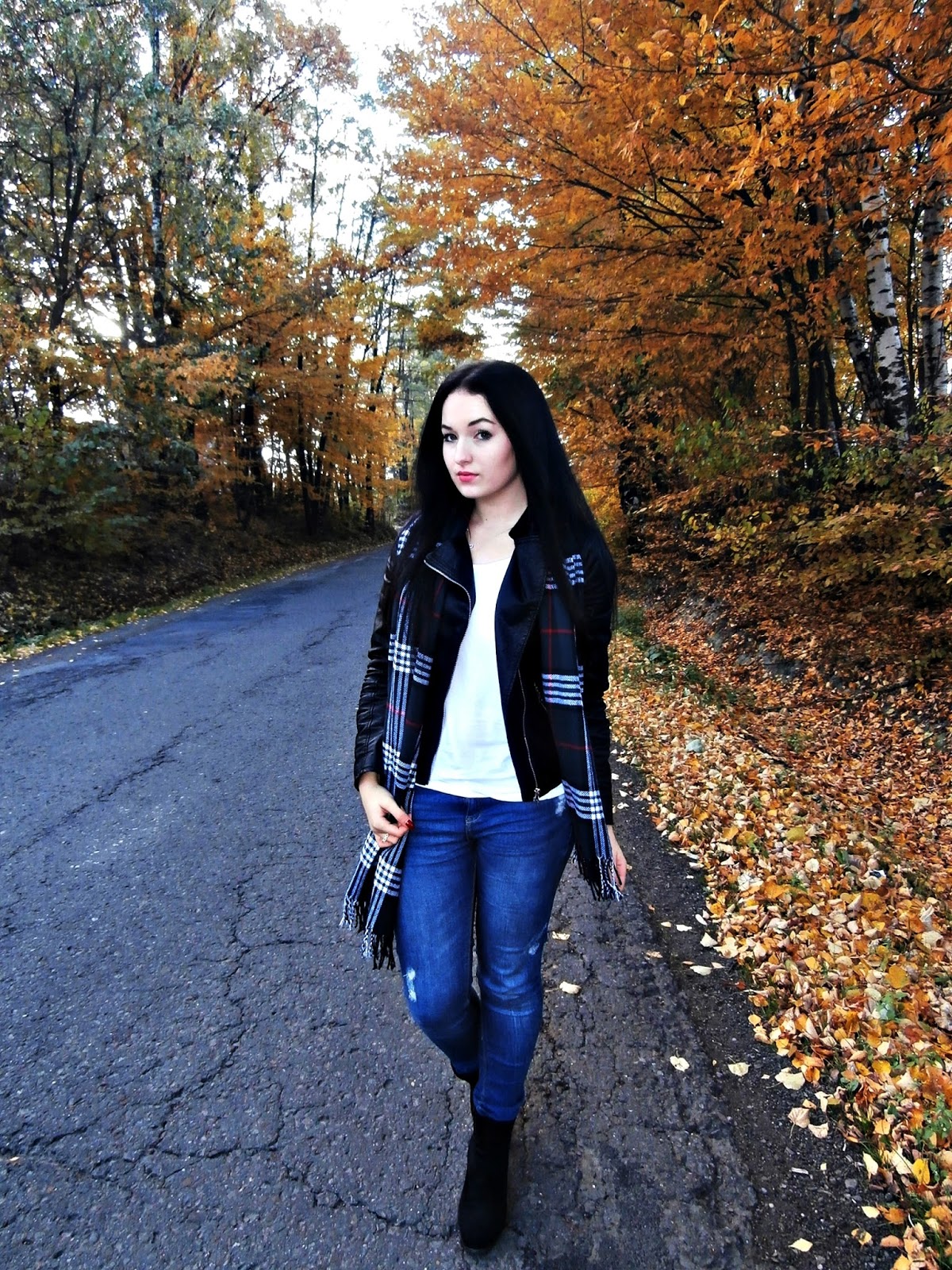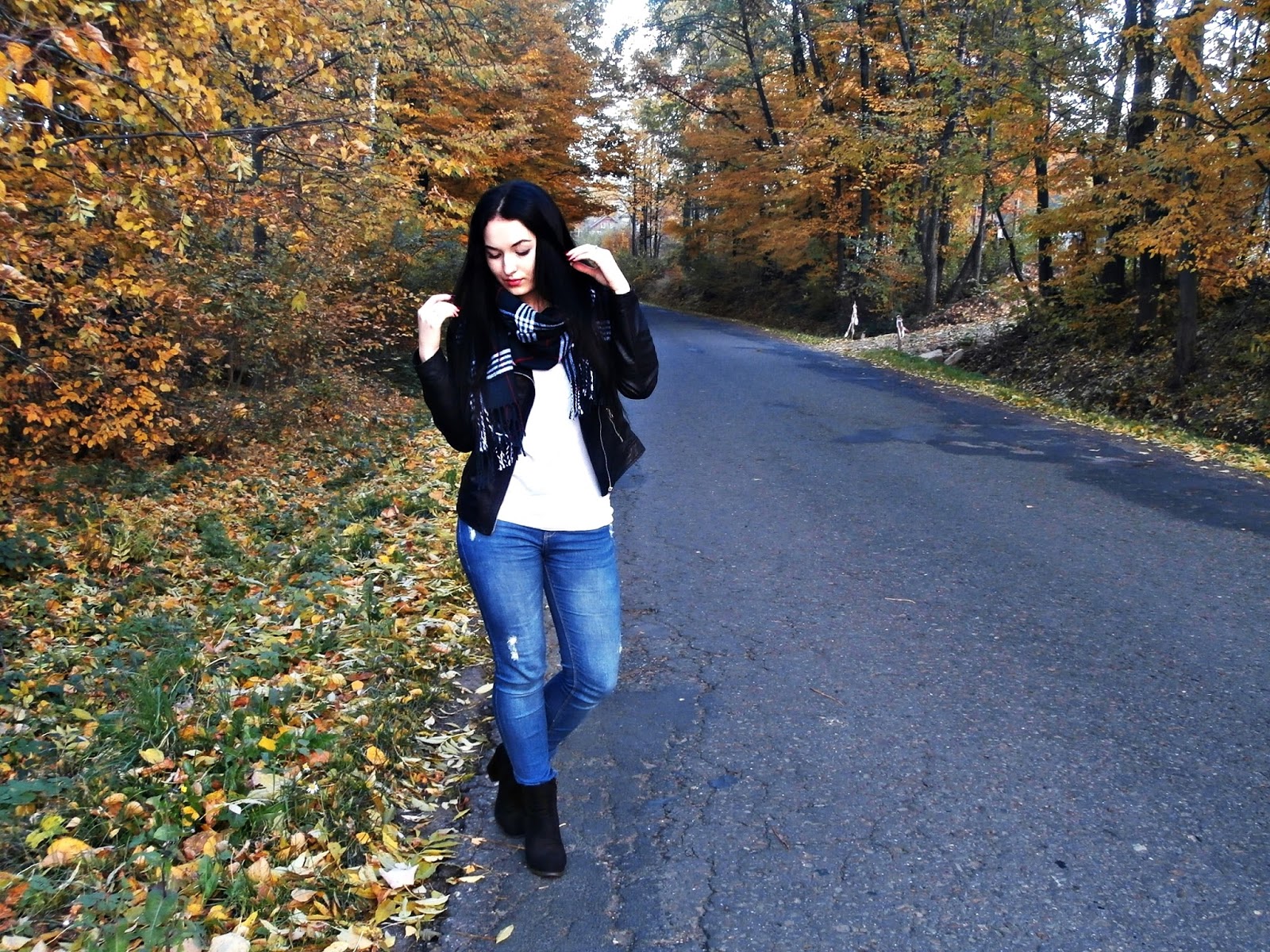 Dlatego też moją bazą w tej stylizacji jest biały t-shirt i jeansy. Do tego czarne botki, czarna ramoneska i mój ulubiony szal. I jak? Bez żadnego kombinowania, a myślę, że wyszło całkiem nieźle