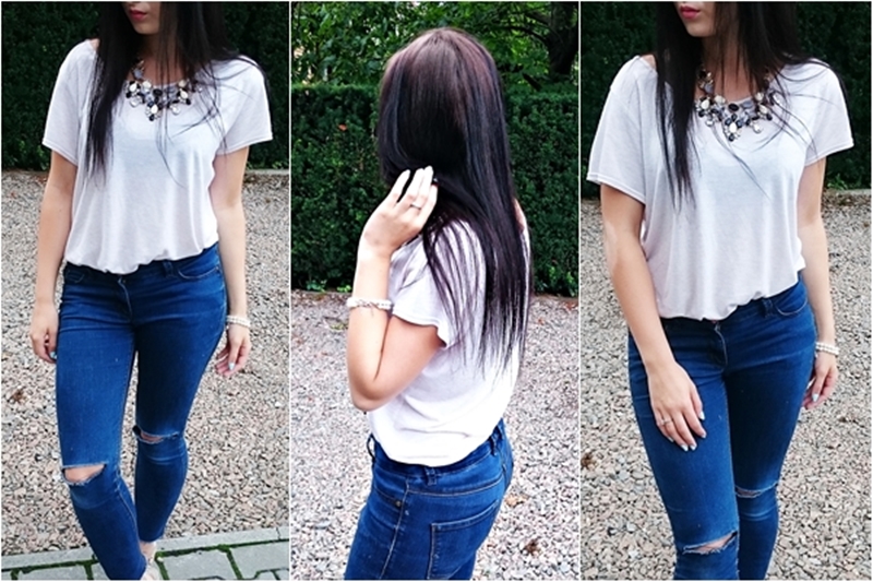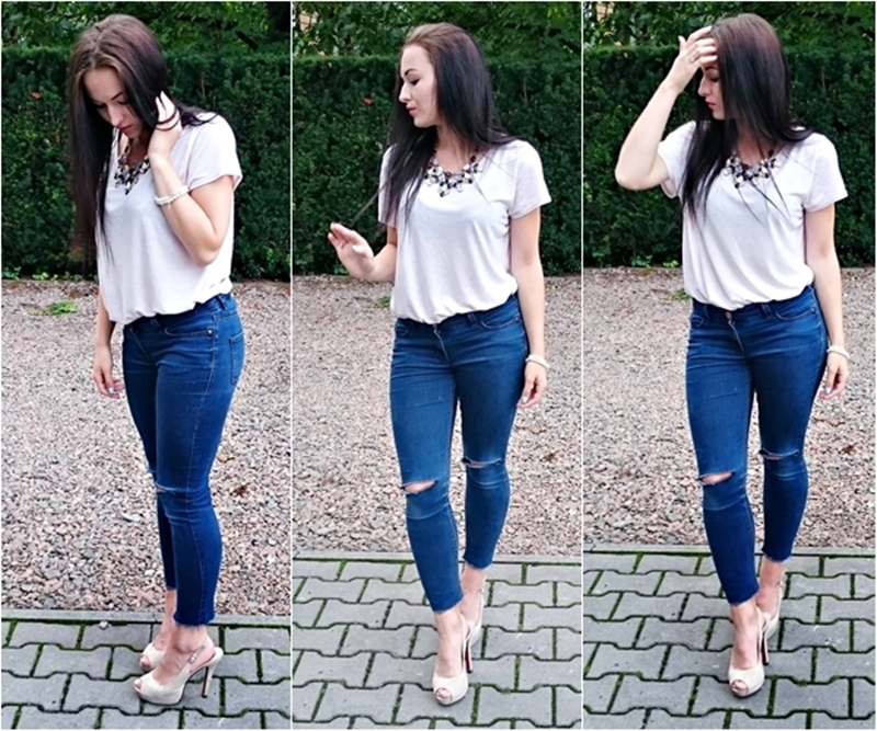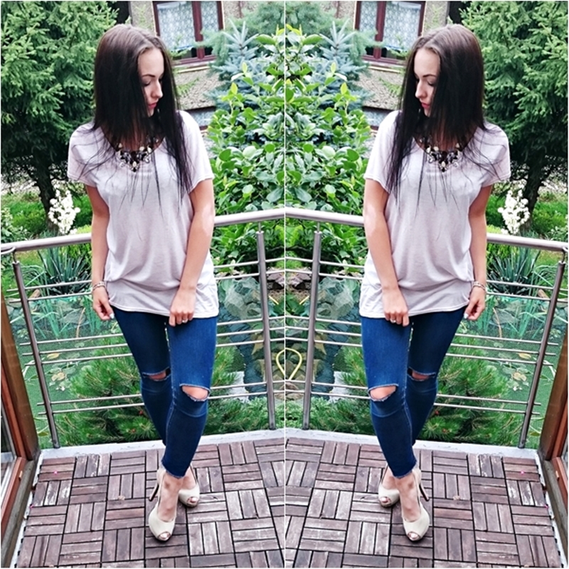 Chciałam tak dobrać stylizację aby czuć się swobodnie ale jednak zaakcentować okazję kolacji we dwoje. Dlatego też mój wybór padł na klasykę. T-shirt w kolorze nude i jeansy z dziurami.