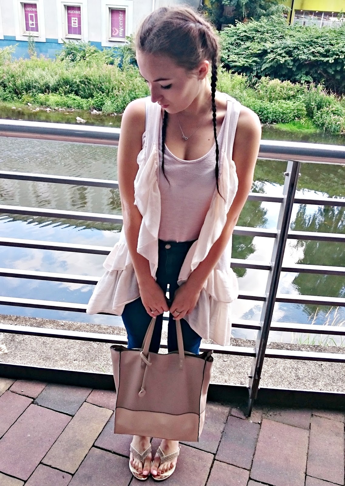 Do niej dobrałam klasyczne rzeczy aby stworzyć bazę. Bokserka w podobnym odcieniu oraz jeansy z wysokim stanem idealnie się skomponowały. W tak ciepły dzień postawiłam na japonki z delikatnym zdobieniem, które dodały nutki elegancji.