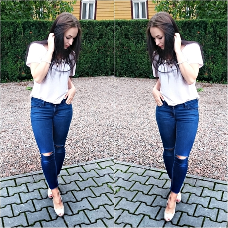 Chciałam tak dobrać stylizację aby czuć się swobodnie ale jednak zaakcentować okazję kolacji we dwoje. Dlatego też mój wybór padł na klasykę. T-shirt w kolorze nude i jeansy z dziurami.